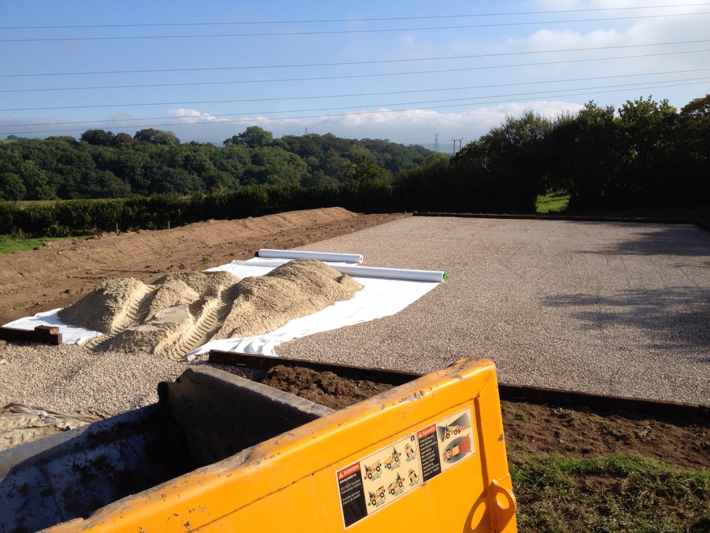 After the drainage has been installed, the geotextiles are laid and the sand is transported in and levelled and compacted over.